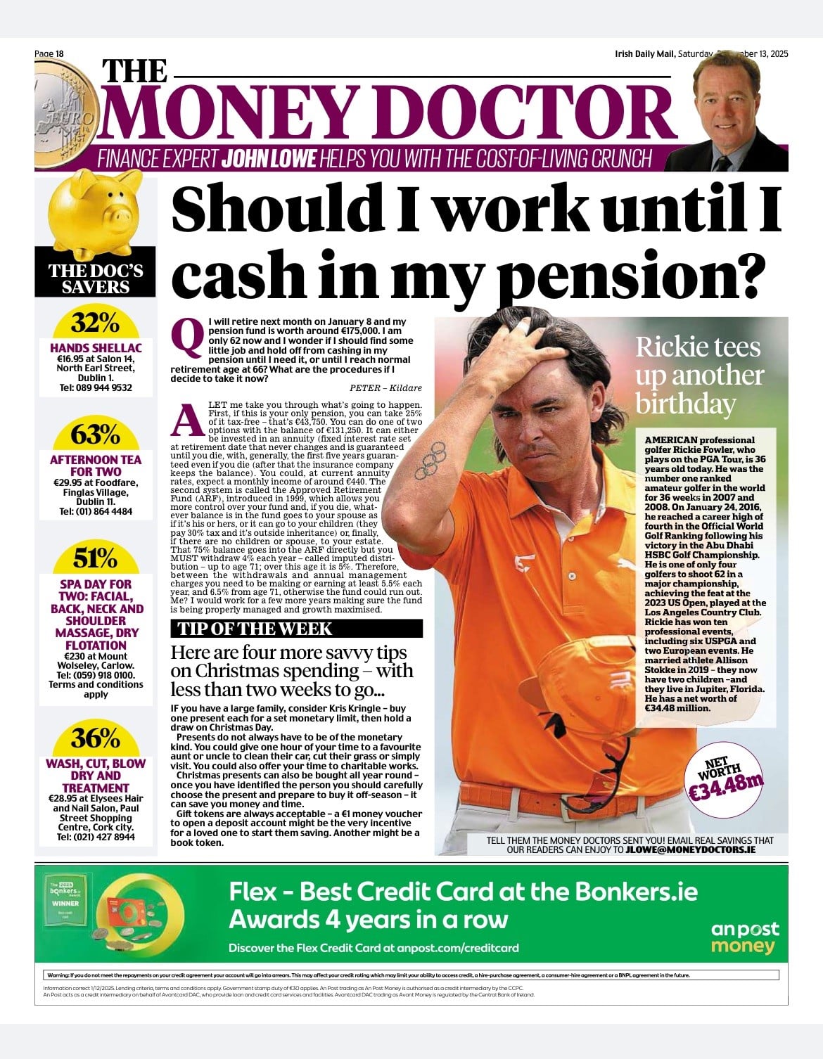 Q – I am retiring 8th January next month and my own pension fund is worth c. € 175,000. I am only 62 now and wondering should I find some little job and hold off from cashing in my pension til I need it or til I reach normal retirement age ? What are the procedures if I do decide to take it now ? Peter – Kildare