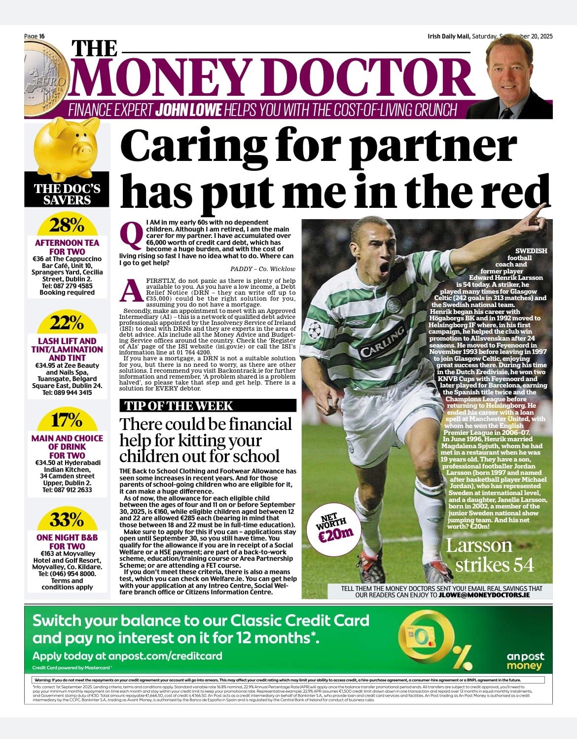 Q – I am in my early 60s with no dependent children. Although I am retired, I am the main carer for my partner. I have accumulated over €6,000 of credit card debt, which has become a huge burden and with the cost of living rising so fast I have no idea what to do. Where can I go to get help? Paddy – Wicklow Co Wicklow
