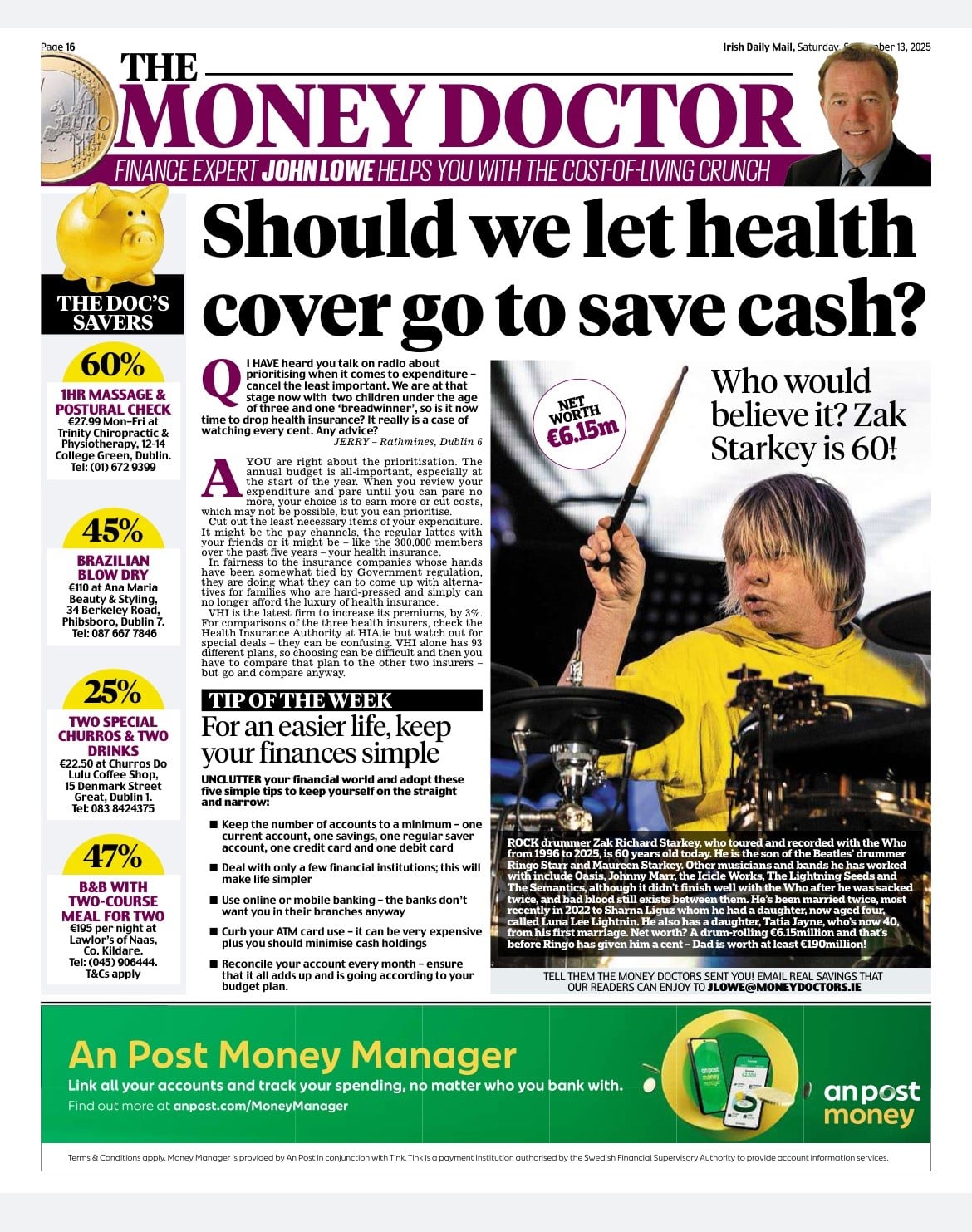 Q – I have heard you talk on radio about prioritising when it comes to expenditure – cancel the least important. We are at that stage now with 2 children under the age of 3 and one “bread-winner” and is it now time to drop health insurance? It really is a case of watching every cent. Any advice ? Jerry – Rathmines Dublin 6