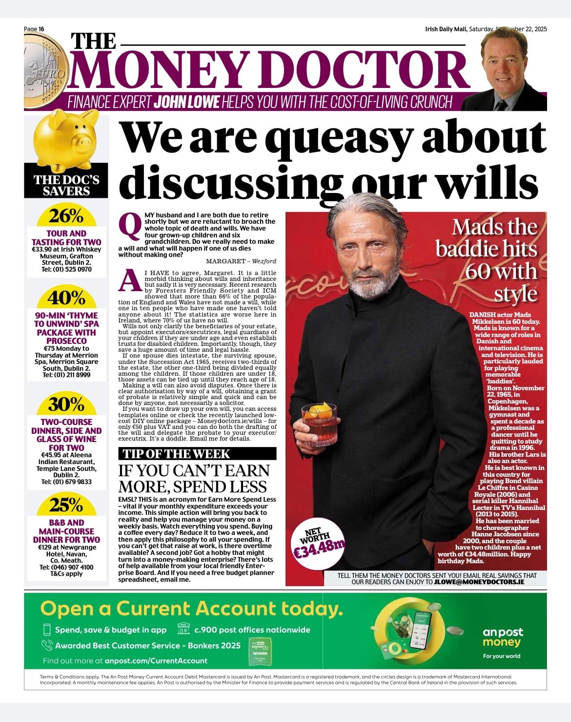 A – I have to agree Margaret, it is a little morbid thinking of Wills and inheritance but sadly very necessary. Recent research by Foresters Friendly Society and ICM showed that more than 66% of the population in England and Wales have NOT made a Will while one in ten people who have made a Will have nt told anyone about it ! The statistics are worse in Ireland with 70% without Wills. Wills not only clarify the beneficiaries of your estate, but appoint executors/executrices, legal guardians of your children if underage and even establish trusts for disabled children. Importantly though, it saves a huge amount of time and legal hassle. If one spouse dies intestate, the surviving spouse under the Succession Act 1965 receives 2/3rds of the estate, the other 1/3rd divided equally between the children. If those children are under 18, those assets can be tied up until they reach age 18. Making a Will can also avoid disputes. Once there is a clear irrevocable authorisation by way of a Will, obtaining a Grant of Probate is relatively simple and quick and can be done by anyone, not necessarily a solicitor. If you wish to draw up your own Will, you can access Will templates online or check the recently launched low-cost DIY online package – www.moneydoctors.ie/wills only € 50 plus VAT and you can do both the drafting of the Will and delegate the Probate to your executor/executrix. It’s a doddle. Email me for details.